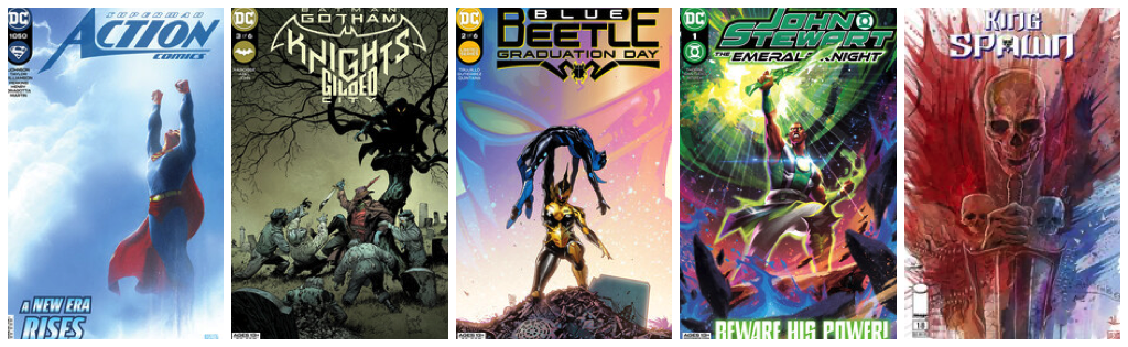 Action Comics #1050; Batman Gotham Knights Gilded City #3; Blue Beetle Graduation Day #2; John Stewart The Emerald Knight #1; King Spawn #18