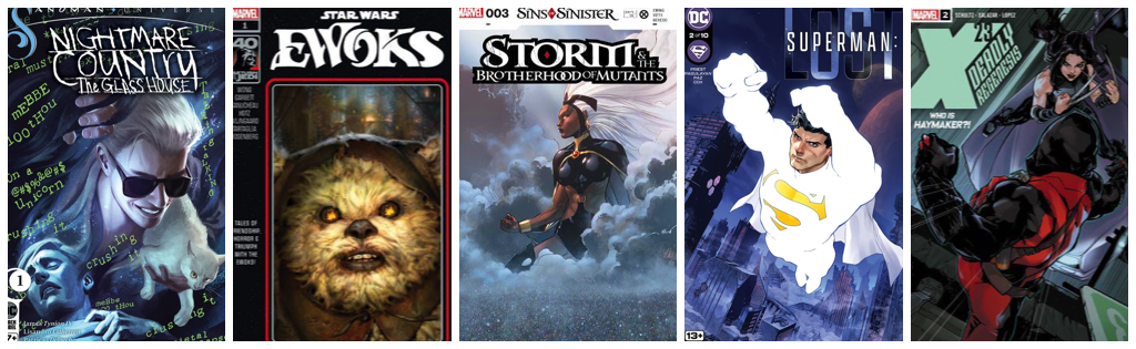 Sandman Universe: Nightmare Country – The Glass House #1; Star Wars Return of the Jedi: Ewoks #1; Storm & the Brotherhood of Mutants #3; Superman: Lost #2; X-23 Deadly: Regenesis #2