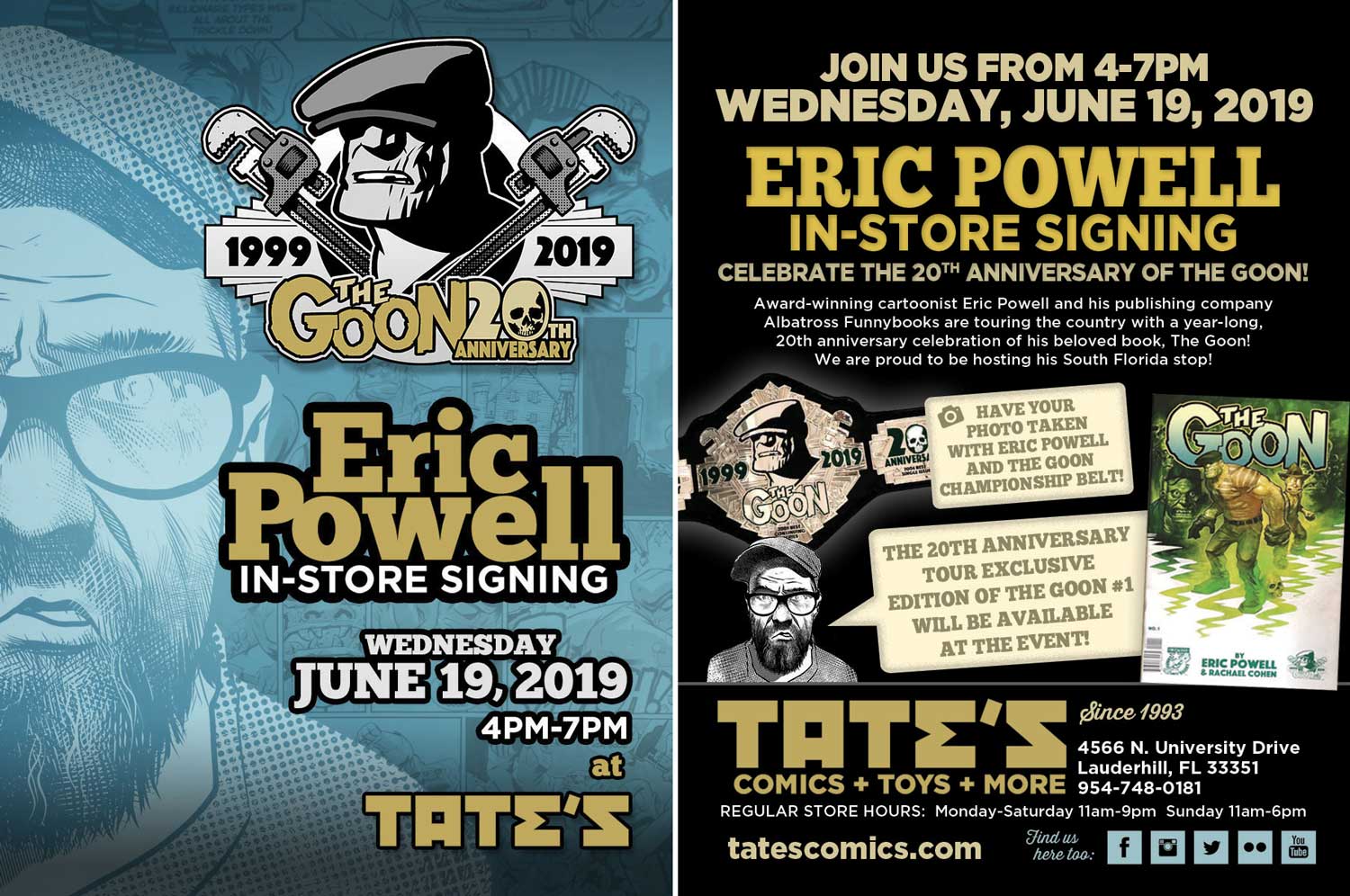 Award-winning cartoonist Eric Powell and his publishing company , Albatross Funnybooks, are touring the country with a year-long, 20th anniversary celebration of his beloved book, The Goon! We are proud to be hosting his South Florida stop!
