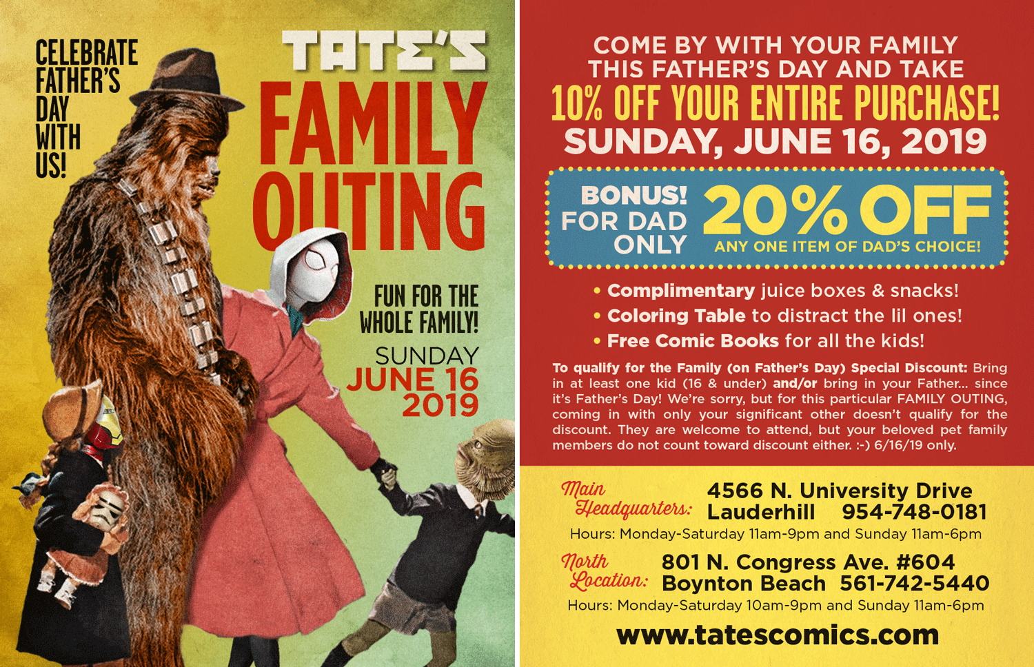 To qualify for the Family (on Father’s Day) Special Discount: Bring in at least one kid (16 & under) and/or bring in your Father… since it’s Father’s Day! We’re sorry, but for this particular FAMILY OUTING, coming in with only your significant other doesn’t qualify for the discount. They are welcome to attend, but your beloved pet family members do not count toward discount either. 🙂 Valid 6/16/19 only!