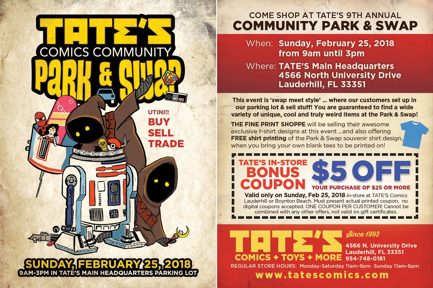 You are sure to find some treasures at TATE’S Comics Community Park & Swap!  This event is ‘swap meet style’ … where our customers set up in our parking lot & sell stuff! You are guaranteed to find a wide variety of unique, cool and truly weird items at the Park & Swap! This is one of our customer’s FAVORITE events, don’t miss it!