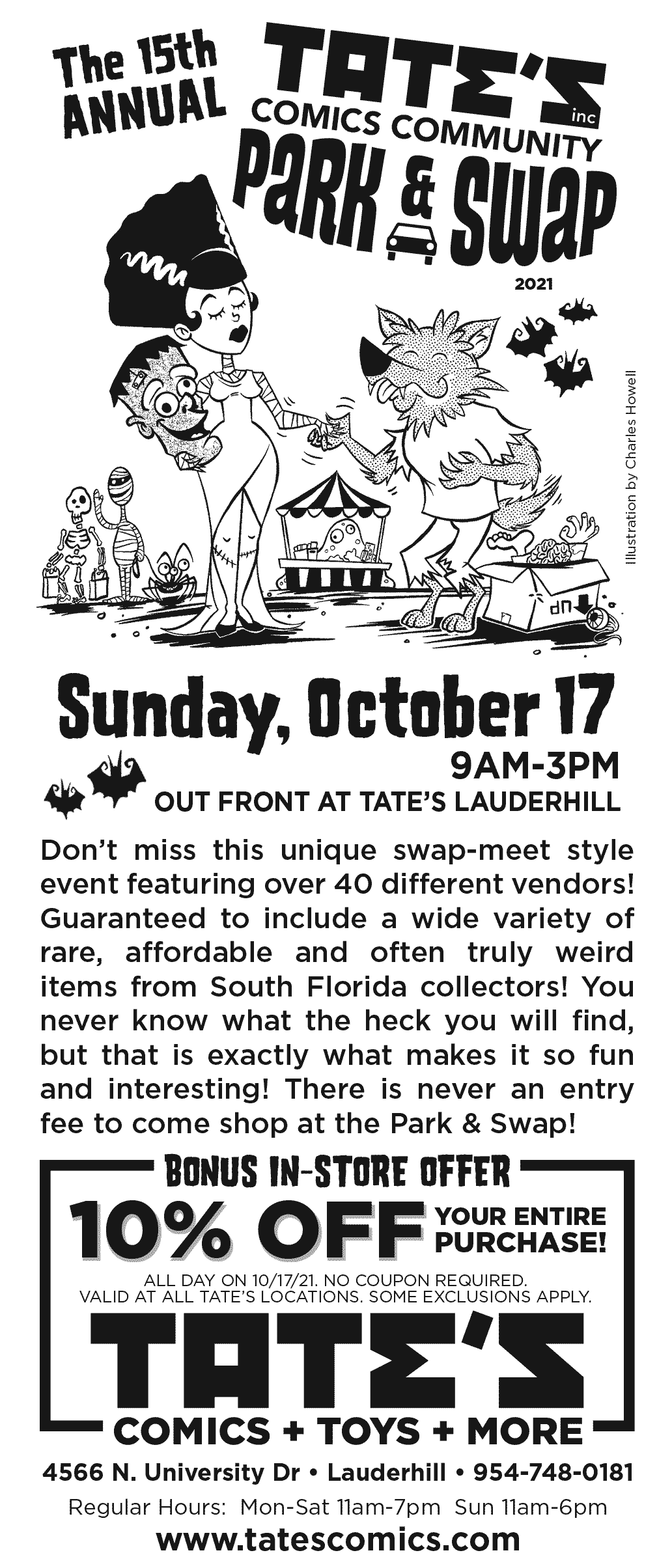 BONUS IN-STORE OFFER 10% off your entire purchase! All day on 10/17/21. No coupon required. Discount valid at all TATE’S locations. Some exclusions apply.