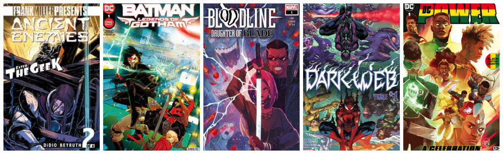 Ancient Enemies #2; Batman Legends of Gotham #1; Bloodline: Daughter of Blade #1; Dark Web Finale #1; DC Power: A Celebration #1