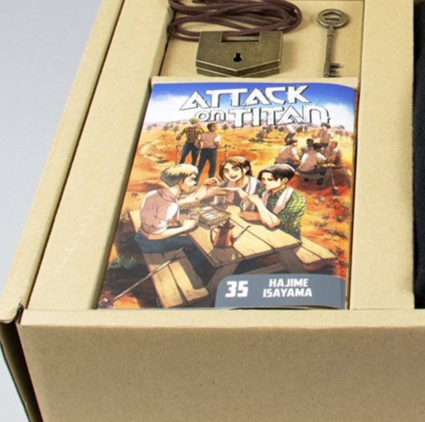 Attack on Titan 35: FLY Collector’s Box Set includes a colossal color art book with an original interview with creator Hajime Isayama, replicas of Eren’s key and Mikasa’s scarf, and, for the first time, the exclusive manga booklet Volume 35.