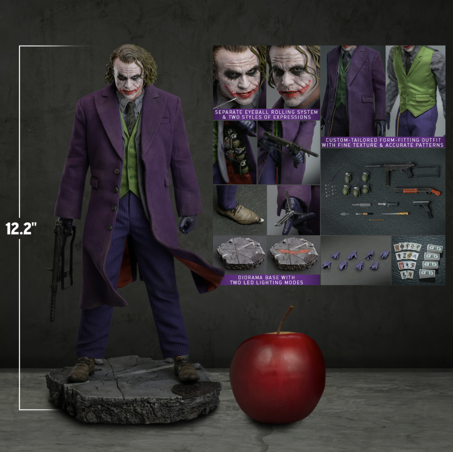 His chaotic look completed with detailed weapons and accessories such as guns, grenades, knives, playing cards, bank note and a LED lighted diorama base with the famous bat symbol. It’s a base with two lighting modes for alternate display.