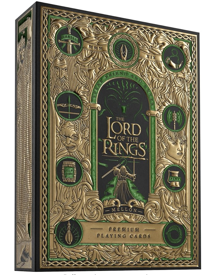 Crafted with the gold that Sauron used to forge the One Ring, along with emerald green foil that reflects the luscious landscape of The Shire, the box is truly one of a kind. The cards themselves are made in the USA – printed on FSC-certified paper derived from sustainable forests, using vegetable-based inks and starch-based laminates.