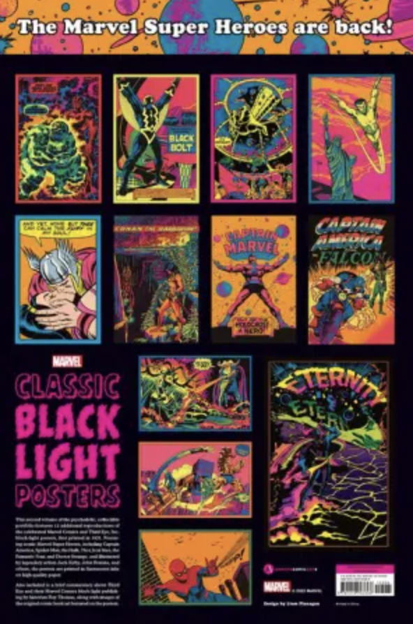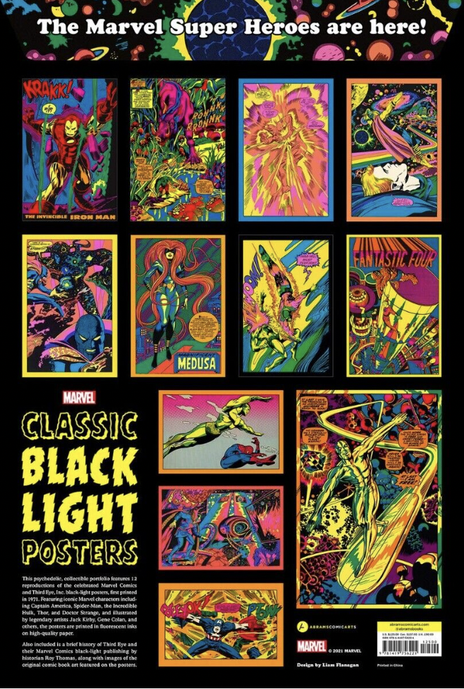 Timed for the 50th anniversary, a collectible portfolio featuring 12 ready-to-frame reproductions of the iconic Marvel Comics black light posters