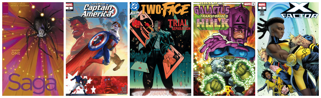 Saga #71; Sam Wilson Captain America #1; Two-Face #2; What If..Galactus Transformed Hulk? #1; X-Factor #6