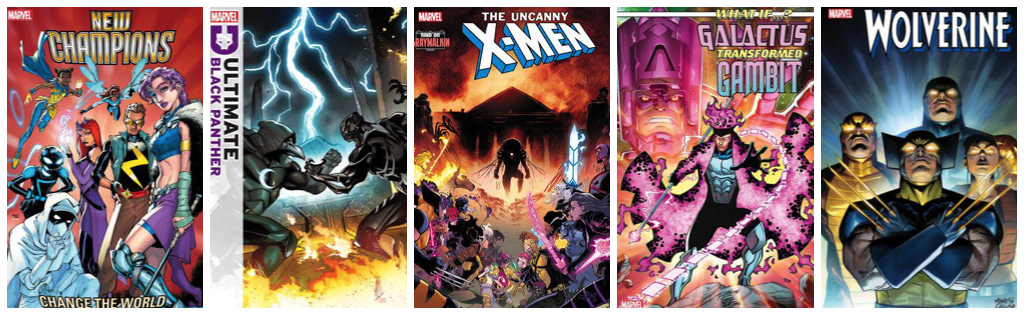 New Champions #1; Ultimate Black Panther #12; Uncanny X-Men #8; What if.. Galactus Transformed Gambit #1; Wolveine #5