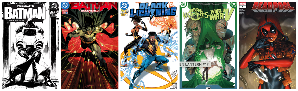 Absolute Batman Noir Edition #1; Batman Uncovered #1; Black Lightning #1; DC Vs Vampires World War V #4; Deadpool #8