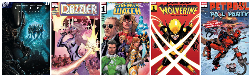 Alien: Paradiso #1; Dazzler #4; Infinity Watch #1; Laura Kinney Wolverine #1; Petpool: Pool Party #1
