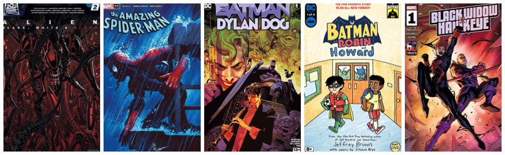 Alien: Black, White, & Blood #1; Amazing Spider-Man #45; Batman & Dylan Dog #1; Batman & Robin & Howard #1; Black Widow & Hawkeye #1