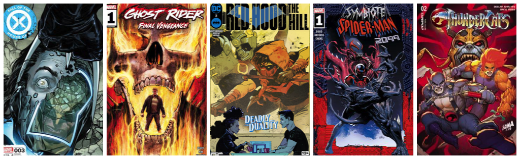 Fall of House of X #3; Ghost Rider: Final Vengeance #1; Red Hood: The Hill #2; Symbiote Spider-Man 2099 #1; Thundercats #2