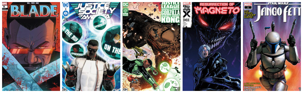 Blade #9; Justice Society of America #9; Justice League Vs. Godzilla Vs. Kong #6; Resurrection of Magneto #3; Star Wars Jango Fett #1