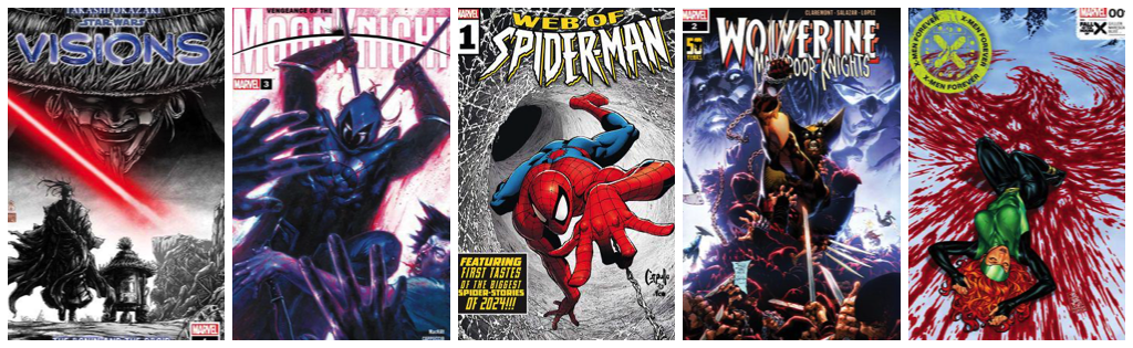 Star Wars: Visions #1; Vengeance of Moon Knight #3; Web of Spider-Man #1; Wolverine: Madripoor Knights #2; X-Men Forever #1