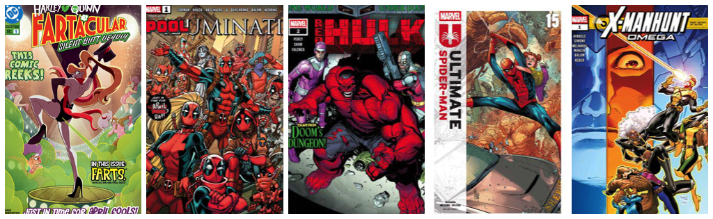 Harley Quinn: Silent Butt Deadly #1; Pooluminati #1; Red Hulk #2; Ultimate Spider-Man #15; X-Manhunt Omega #1