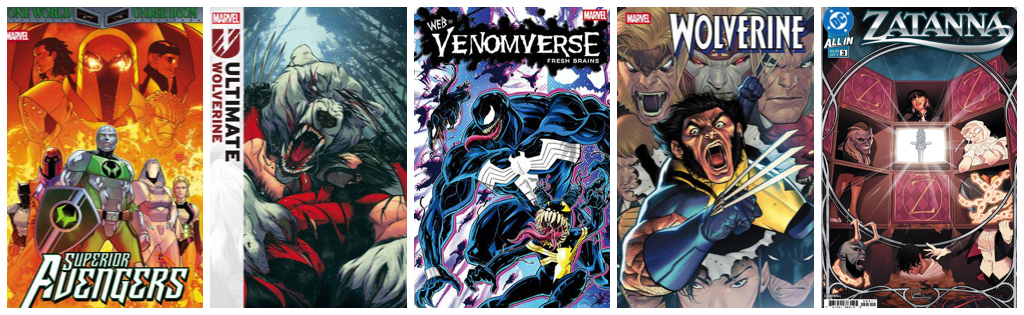 Superior Avengers #1;Ultimate Wolverine #4; Web of Venomverse: Fresh Brains #1; Wolverine #8; Zatanna #3