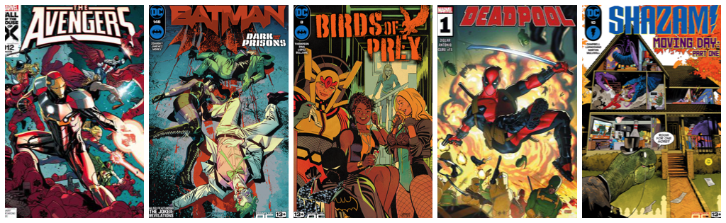 Avengers #12; Batman #146; Birds of Prey #8; Deadpool #1; Shazam #10
