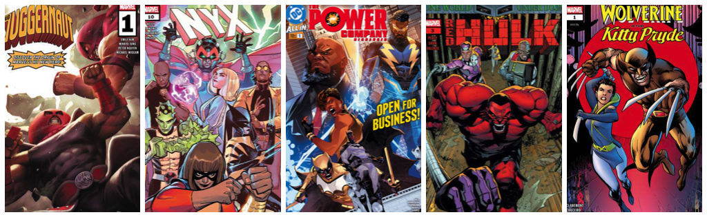 Kid Juggernaut #1; Nyx #10; Power Company: Recharged #1; Red Hulk #3; Wolverine & Kitty Pryde #1