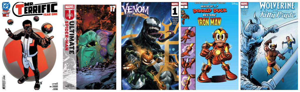 Mr. Terrific: Year One #1; Ultimate Spider-Man #17; Venom: Original Sin #1; What If…Donald Duck Became Iron Man #1; Wolverine & Kitty Pryde #2