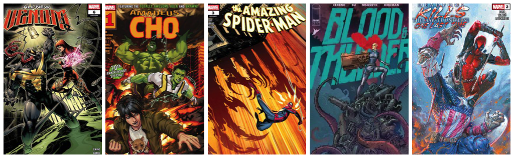 All New Venom #6; Amadeus Cho 20th Anniversary Special #1; Amazing Spider-Man #3; Blood & Thunder #1; Deadpool Kills The Marvel Universe One Last Time #2
