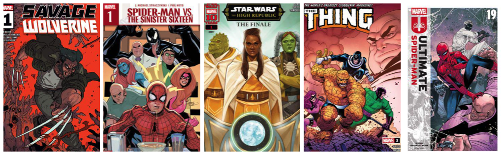 Savage Wolverine #1; Spider-Man Vs The Sinister Sixteen #1; Star Wars High Republic: The Finale #1; The Thing #3; Ultimate Spider-Man #19