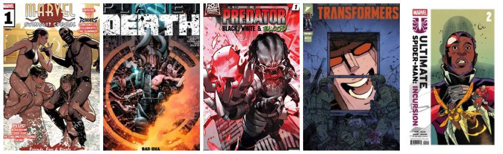 Marvel Swimsuit Special: Friends, Foes, & Rivals #1; Planet Death #1; Predator Black, White, and Blood #1; Transformers #22; Ultimate Spider-Man: Incursion #2