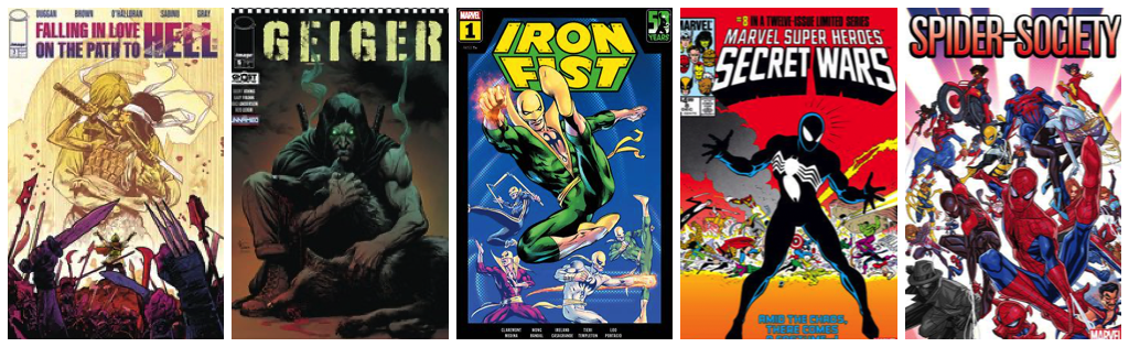 Falling In Love On The Path To Hell #3; Geiger #5; Iron Fist 50th Anniversary Special #1; Marvel Super Heroes Secret Wars #8 Facsimile; Spider Society #1