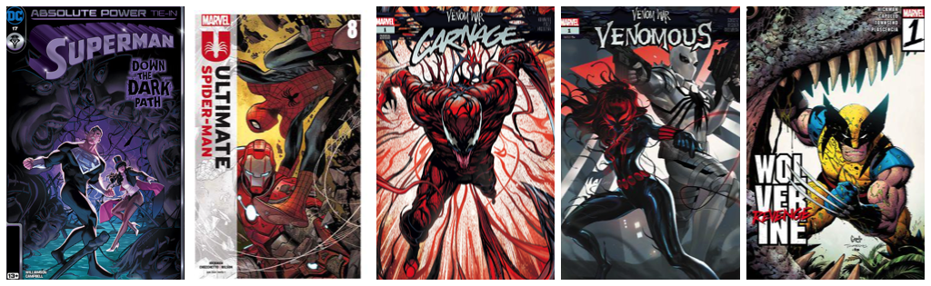 Superman #17; Ultimate Spider-Man #8; Venom War: Carnage #1; Venom War: Venomous #1; Wolverine Revenge #1