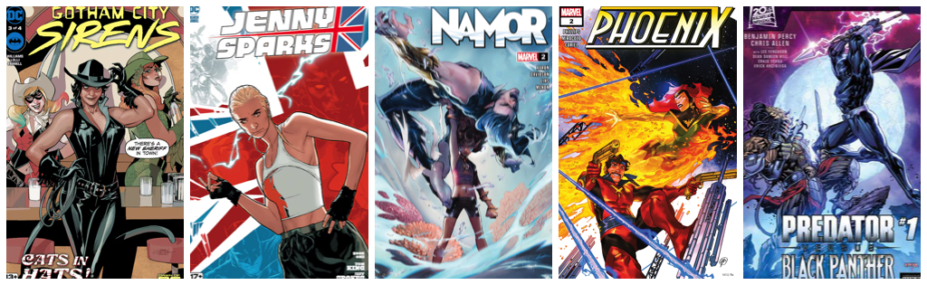 Gotham City Sirens #3; Jenny Sparks #1; Namor #2; Phoenix #2; Predator Vs. Black Panther #1