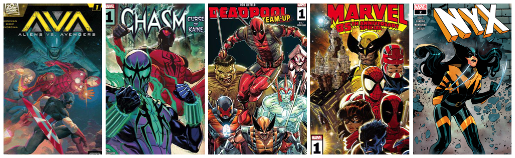 Aliens Vs. Avengers #1; Chasm: Curse of Kaine #1; Deadpool Team-Up #1; Marvel 85th Anniversary Special #1; Nyx #2
