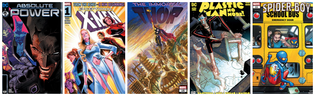 Absolute Power #3; Exceptional X-Men #1; Immortal Thor #15; Plastic Man No More #1; Spider-Boy #11
