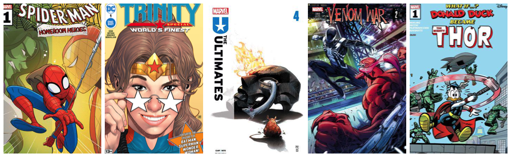 Spider-Man Home Room Heroes #1; Trinity Special: World’s Finest #1; Ultimates #4; Venom War #2; What If..Donald Duck Became Thor #1
